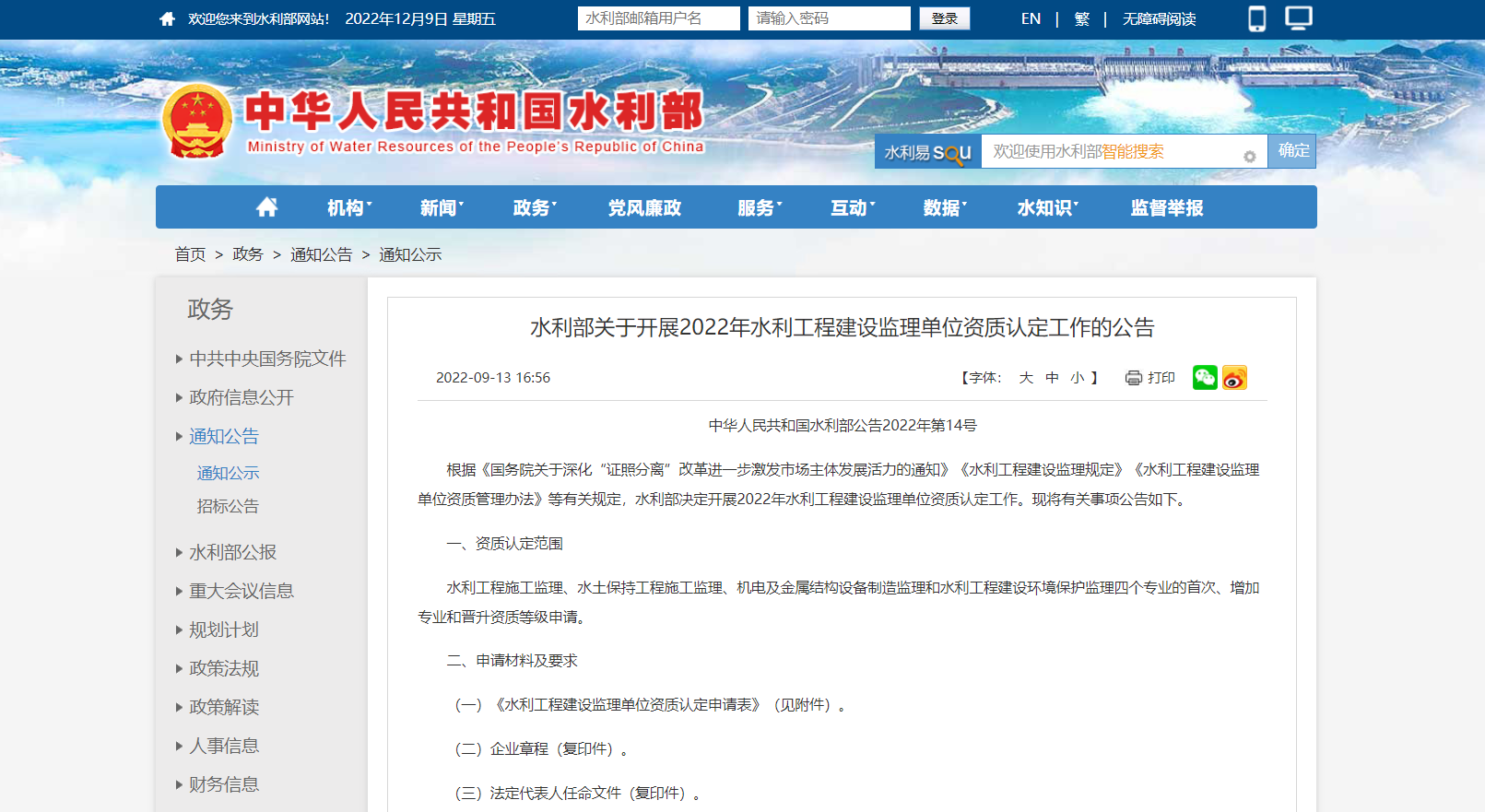 水利部關于開展2022年水利工程建設監理單位資質認定工作的公告